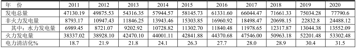 由于中國(guó)發(fā)電以化石燃料為主,特別是燃煤發(fā)電,電力清潔化程度進(jìn)展較慢。電力清潔化%定義為:非火力發(fā)電量/發(fā)電總量。