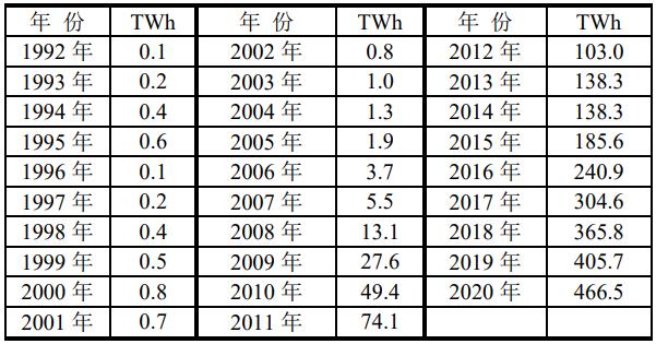 中國風(fēng)電場發(fā)電量進(jìn)程(單位:TWh)
