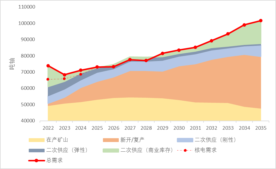 · 2032-2035年,價格由60美元/磅迅速上漲。2032年以后,核電天然鈾需求繼續(xù)增長,目前已知的在產(chǎn)、復產(chǎn)、在建、計劃礦山產(chǎn)量及二次供應彈性部分持續(xù)下降,因此剛性缺口逐漸擴大,若無新勘查開發(fā)的鈾礦山投入生產(chǎn)補充一次供應,商業(yè)庫存將被大量消耗,現(xiàn)貨價格將進入快速上漲階段。
