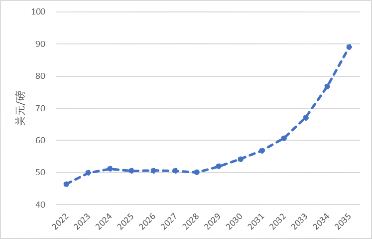 2022-2035年天然鈾年度現(xiàn)貨價預測