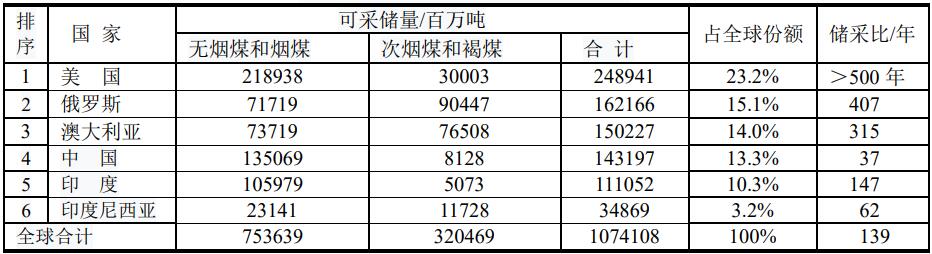 全球原煤可采儲量前6位國家的產(chǎn)量(單位:百萬噸)