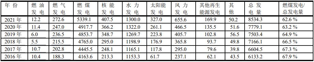 根據(jù)中國國家統(tǒng)計局的數(shù)據(jù),列出下表。可以容易看出,中國能源是以燃煤發(fā)電為主。中國燃煤發(fā)電量占中國發(fā)電總量的百分比在逐年降低。