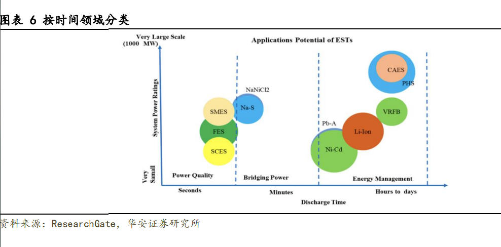 根據儲能時長,可以分為短期、中期和長期儲能。根據能量釋放持續(xù)時間,可以將 儲能方式進行區(qū)域分類。中等持續(xù)時間的類別分鐘到小時之間,功率范圍在 10-100MW。 長時間類別跨度為數小時到數天,功率范圍在 300MW 以上。目前大多數部署的電池儲存 設施的儲存時間為 4 小時或更短,如鉛酸電池、部分鋰電池、電磁儲能,可用于調峰調 頻、平滑出力、緊急備用等;大多數現有的抽水蓄能設施的持續(xù)時間為 8 - 12 小時或更 長,屬于長期儲能,可用于電網調峰調頻、備用容量等。每一種應用對儲能技術都有其 特定的要求。一些應用需要高功率和長存儲時間,而另一些應用則相反。因此,在采用 儲能之前,了解其技術特點及其應用要求是非常重要的。