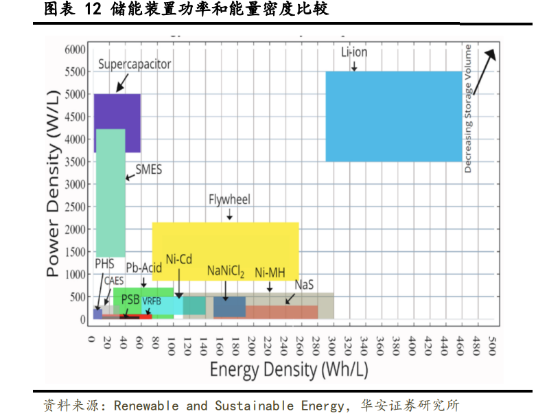 抽水蓄能占據儲能絕對份額,鋰離子電池是電化學儲能主流技術路線。結果表明, 通過對不同儲能技術的功率和能量密度的比較,可以確定儲能裝置的尺寸。儲能裝置的體積隨著功率和能量密度的增加而減小,因此鋰離子電池可以獲得更小的尺寸。另一方 面,左下角顯示了更大體積的儲能設備。所有熱儲能和電化學儲能裝置(Ni-MH, Na-S, Li-ion & NaNiCl2)的能量密度都高于其他儲能裝置。 相反,SCES、SMES 和 FES 的功率密度高于其他儲能設備類型。此外,CAES 和 PHS 的 能量密度最小,同時,CAES、PHS、VRFB、PSB 和 Zn Br 提供的功率密度也最小。