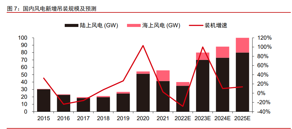風電:受疫情等因素影響,2022 年部分風電項目裝機將延后至 2023 年。2022 年 1-11 月,國內(nèi)風電新增并網(wǎng)量達 22.52GW(-6.8% YoY),預計全年新增并網(wǎng)規(guī)模達 40GW 左 右,同比或有所回落。這主要是由于疫情影響設(shè)備生產(chǎn)交付和項目現(xiàn)場吊裝節(jié)奏,同時疊 加機型方案升級換代,以及部分項目場址審批周期拉長影響。我們預計有 10GW 左右陸上 風電項目裝機將由于外部因素由 2022 年延至 2023 年,短期裝機需求低于預期或為 2023 年需求復蘇進一步夯實基礎(chǔ)。隨著疫情影響逐步緩解,風電經(jīng)濟性大幅提升,以及 2022 年部分延遲項目結(jié)轉(zhuǎn),2023 年國內(nèi)風電裝機有望顯著復蘇,預計總裝機量將達 80GW 左 右,其中海上風電裝機有望實現(xiàn)翻倍增長至 10GW 以上,且 2023-25 年海風裝機仍有望 維持約 40%的較高 CAGR。