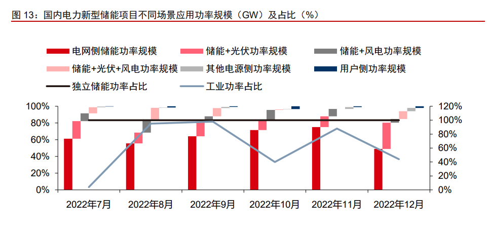 其三,電網(wǎng)側(cè)獨立儲能與電源配儲為主,用戶側(cè)工商業(yè)占比逐漸提升。從應用場景來 看,新型儲能項目主要集中于電網(wǎng)側(cè)(100%為獨立儲能)與電源側(cè)配儲(95%為新能源 配儲)。用戶側(cè)儲能項目功率規(guī)模占比仍較低,但其中工業(yè)項目占比逐步穩(wěn)定在 50%以上。