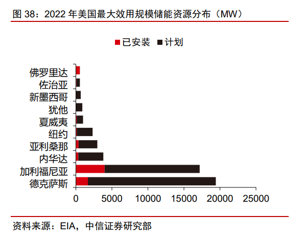 根據(jù) EIA 數(shù)據(jù),美國 2021 年電力結(jié)構(gòu)中,天然氣+煤電發(fā)電量占比 60%。各州規(guī)劃 可再生能源發(fā)電市場配額方案,加州計劃 2030 年實現(xiàn) 60%的可再生能源占比。美國儲能 集中于加州和德州。截至 2022 年 8 月,加州儲能裝機完成 3977MW,在建 13198MW, 德州儲能裝機完成 1653MW,在建 17789MW。2021 年加州風+光的發(fā)電量占總發(fā)電量比 例為 25%,德州風光發(fā)電占比 24%,高于美國全國的 13%。