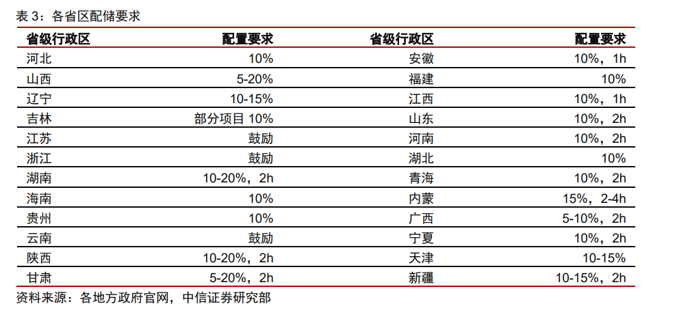 各地區(qū)逐步明確風光配儲要求,推動發(fā)電側(cè)儲能發(fā)展。隨著國家多部委的儲能政策出 臺和持續(xù)細化,各地方政府也在積極響應和明確新增發(fā)電項目的強制性配儲要求,配儲比 例在 5%-10%,配儲時長為 2-4 小時。除少數(shù)省份為部分項目配儲和鼓勵性配儲要求之外, 90%以上的地區(qū)都提出強制性配儲要求。現(xiàn)實需求和政策推動是未來幾年國內(nèi)儲能裝機的 主要驅(qū)動因素。