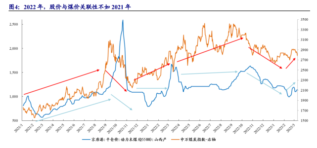 2021年,煤炭行業(yè)經(jīng)歷一輪典型的周期。2021年煤價(jià)先漲后跌,股價(jià)緊隨煤價(jià)波動(dòng),周期屬性明顯。1-9月,疫后需求恢復(fù),經(jīng)濟(jì)快速增長,煤炭供不應(yīng)求—煤價(jià)持續(xù)上漲,股價(jià)一路上行;10-12月,政策限價(jià),需求季節(jié)性轉(zhuǎn)弱,產(chǎn)能核增,供給釋放,預(yù)期走弱—煤價(jià)下跌,股價(jià)回調(diào)。2021年股價(jià)與煤價(jià)關(guān)聯(lián)性很強(qiáng),股價(jià)基本提前反應(yīng)煤價(jià)變化,股價(jià)走勢與煤價(jià)走勢基本一致。從疫后需求恢復(fù),煤價(jià)上漲,到產(chǎn)能釋放,政策限價(jià),煤炭行業(yè)經(jīng)歷一輪典型周期,股價(jià)亦先漲后跌。