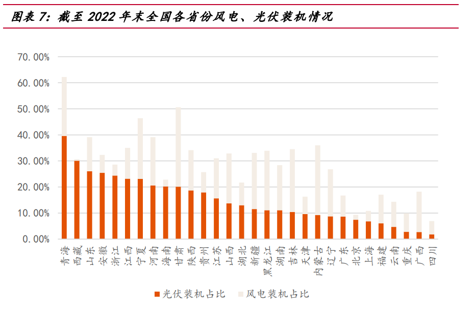 截至 2022 年末,全國各省風電、光伏裝機量占各省總裝機量比例前五名的為青 海、西藏、河北、寧夏、安徽(按光伏裝機排序);全國各省風電、光伏發(fā)電量占各 省總發(fā)電量比例前五名的為青海、西藏、寧夏、甘肅、山東。 考慮到新能源滲透率與分時電價特征高度相關,因此全國多個省份均可出現類似 山東省的電價分時特征,如青海、寧夏、甘肅等。