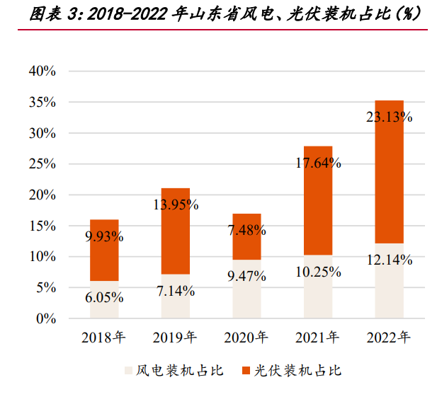 在新能源占比較高的地區(qū),相應時段電價較低。由于新能源發(fā)電邊際成本低的特 質,在新能源高發(fā)期間,如果用電需求較低,則相應時段市場電價較低。以山東省電 力現貨市場為例: 2018-2022 年,山東省風電、光伏裝機容量及發(fā)電量持續(xù)增長,風電、光伏裝機 容量自 1146/1361 萬千瓦增長至 2302/4270 萬千瓦,CAGR 達 14.97%/25.69%,風電、 光伏裝機占總裝機量比例自 6.05%/9.93%擴張至 12.14%/23.13%;風電、光伏發(fā)電量 占總發(fā)電量比例自 2.32%/0.55%擴張至 5.28%/11.25%。