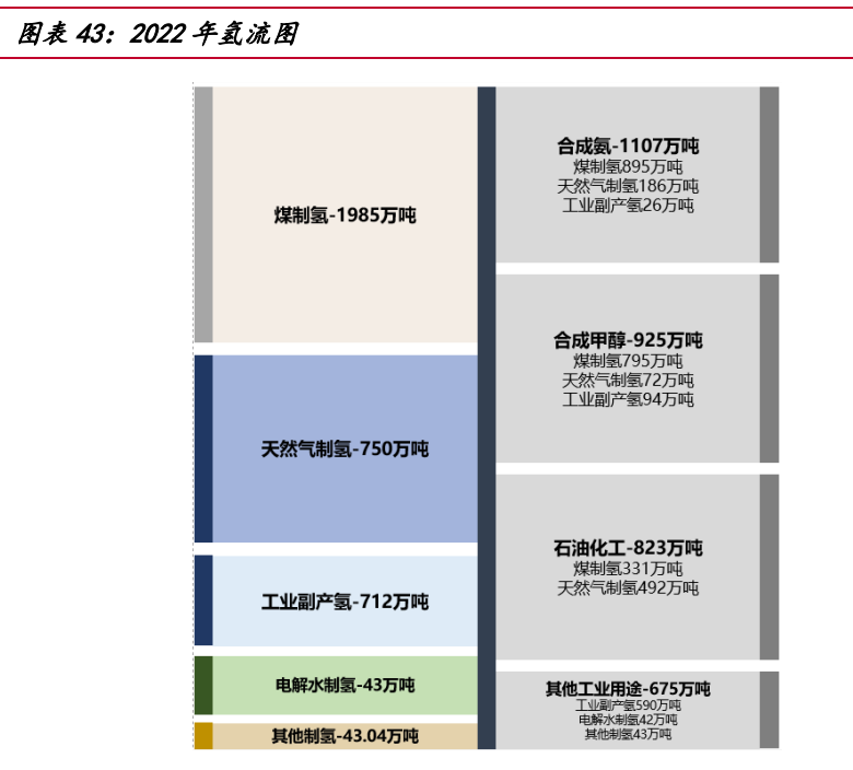 當(dāng)前國內(nèi)氫能大部分應(yīng)用于工業(yè)領(lǐng)域,包括合成氨、合成甲醇及石油化工。隨著 長期碳中和目標(biāo)的提出,氫氣的能源屬性將逐漸顯現(xiàn),應(yīng)用領(lǐng)域?qū)⒅鸩酵卣怪岭娏Α?交通、建筑等場景。以中國 2022 年氫產(chǎn)能下游應(yīng)用為例,其中合成氨氫氣需求 1107 萬噸,占 31.1%。合成氨作為化肥和其他化工產(chǎn)品的重要原材料,60%用于農(nóng)業(yè)化肥生 產(chǎn),30%用于工業(yè)生產(chǎn),而交通部門(船舶運(yùn)輸)和發(fā)電部門(摻氨燃燒)占比很低。 合成甲醇?xì)錃庑枨?925 萬噸,占 26.2%。合成甲醇大部分用于化工合成,主要合成 產(chǎn)品為烯烴、甲醛、醋酸、MTBE 以及二甲醛等。石油煉化氫氣需求 823 萬噸, 占 23.3%。 未來,氫氣因其熱值高,質(zhì)量能量密度大的特點(diǎn)或?qū)⒈粡V泛應(yīng)用于交通領(lǐng)域,氫 燃料電池汽車比傳統(tǒng)的純電動(dòng)車具備更長的續(xù)航能力。2022 年我國氫燃料電池車?yán)?計(jì)銷量 12682 輛,加氫站累計(jì)建成 274 座,依據(jù)中國國家發(fā)展和改革委員會(huì)發(fā)布《氫 能產(chǎn)業(yè)發(fā)展長期規(guī)劃(2021-2035)》提出,到 2025 年燃料電池車輛保有量約為 5 萬 輛。同時(shí),因氫氣單位質(zhì)量的熱值遠(yuǎn)大于天然氣,能夠更好地滿足建筑供熱需求而應(yīng) 用于建筑發(fā)電等其他領(lǐng)域。