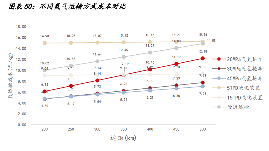 氣氫拖車是目前國內(nèi)最成熟的氫氣運(yùn)輸形式,我國氫氣管束式集裝箱和氫氣長管 拖車大多采用鋼制大容積無縫高壓氣瓶和鋼制內(nèi)膽碳纖維環(huán)向纏繞氣瓶,工作壓力通 常為 20Mpa,單次運(yùn)輸氫氣質(zhì)量小,運(yùn)輸效率低,適用于 200 公里以內(nèi)的短距離運(yùn)輸。 綜合市場上管束式氫氣集裝箱的平均輸氫量,假設(shè) 20/30/45MPa 管束式集裝箱最大可 運(yùn)輸氫氣質(zhì)量 340/650/950 千克,管束式集裝箱費(fèi)用 60/70/80 萬,單位壓縮電耗 2/4.5/6kWh/kg,則運(yùn)距 500 公里的運(yùn)輸成本高達(dá) 7 元/kg 以上。