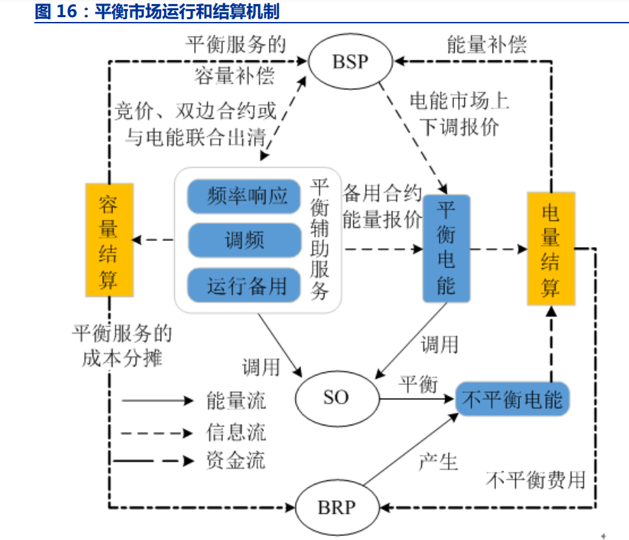 歐洲的平衡市場(chǎng)源于 2017 年 12 月 23 日歐盟委員會(huì) EB 條例,該條例給出一個(gè)指導(dǎo) 方針,使得各國(guó)可以在平衡市場(chǎng)中共享資源,從而使發(fā)電量始終與用電量相等。從實(shí)際達(dá) 成的效果來看,歐洲平衡市場(chǎng)與我國(guó)的調(diào)頻輔助服務(wù)類似。 在平衡市場(chǎng)中,調(diào)度智能歸于 TSO 或者 DSO,參與平衡市場(chǎng)運(yùn)行和結(jié)算的市場(chǎng)成員 包括 BSP(BalanceServiceProvider,BSP)和 BRP(BalanceResponsibilityParty,BRP) 等。其中 BSP 提供平衡資源,在實(shí)際運(yùn)行中根據(jù)系統(tǒng)頻率變化或調(diào)度指令改變自身出力以 幫助系統(tǒng)恢復(fù)平衡,BRP 是承擔(dān)責(zé)任并參與不平衡結(jié)算的市場(chǎng)成員。