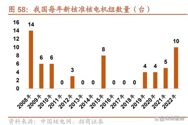 2021 年國家首次提出“積極有序發(fā)展核電”。同年,我國新增 5 臺核準機組;2022 年新核準 10 臺機組,核電審批和 開工節(jié)奏明顯提速。根據(jù)世界核協(xié)會,截至 2023 年 5 月,我國在運+在建機組總數(shù)達到 77 臺,已經(jīng)超過法國,僅次 于美國。預計在未來 5 年間,中國將進一步加快擴大裝機規(guī)模,保持每年 6 至 8 臺核電機組的核準開工節(jié)奏。