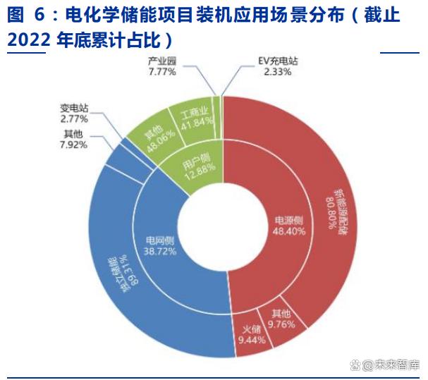 從應(yīng)用場(chǎng)景看,2022 年儲(chǔ)能應(yīng)用場(chǎng)景仍以新能源配儲(chǔ)及電網(wǎng)側(cè)獨(dú)立儲(chǔ)能為主。根據(jù) 中電聯(lián)統(tǒng)計(jì)口徑,截至 2022 年底,已投運(yùn)的電化學(xué)儲(chǔ)能電站累計(jì)裝機(jī)主要分布在電源側(cè), 占比達(dá) 48.4%,其次為電網(wǎng)側(cè) 38.72%和用戶側(cè) 12.88%。2022 年各應(yīng)用場(chǎng)景新增裝機(jī)占 比基本保持不變,電源側(cè)占比 49.24%,其次為電網(wǎng)側(cè) 43.13%和用戶側(cè) 7.63%。從具體 場(chǎng)景看,新能源配儲(chǔ)為電源側(cè)主要場(chǎng)景,獨(dú)立儲(chǔ)能為電網(wǎng)側(cè)主要場(chǎng)景。