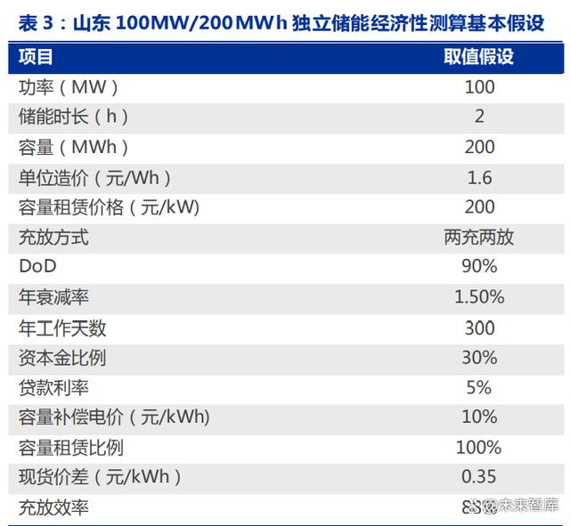 獨立儲能已初步具備盈利能力。以山東 100MW/200MWh 獨立儲能電站為例(全生命周期 10 年,循環(huán)次數 6000 次,年衰減 1.5%),其儲能盈利模式為現貨市場套利+容 量租賃+容量補償。山東省容量租賃標準采用市場競價方式,制定最高限價及最低保底價, 假設成交價為 200 元/kW*年,容量電價為 0.0991 元/kWh,假設現貨市場價差維持在 0.35 元/kWh,年工作天數為 300 天,儲能系統成本為 1.6 元/Wh,則其全投資 IRR 可達 7.20%。