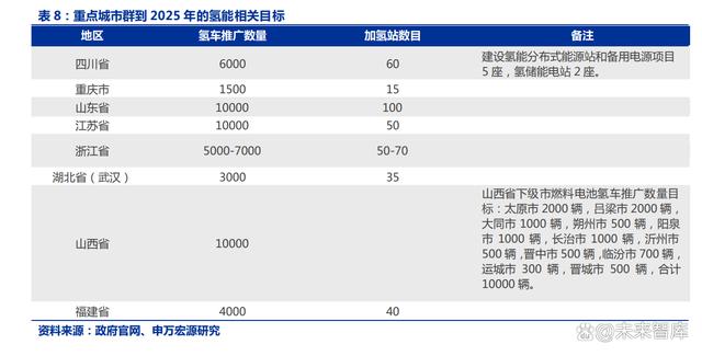四川省政府在2020年9月發(fā)布《四川省氫能產(chǎn)業(yè)發(fā)展規(guī)劃(2021-2025年)》,提出2025年目標:1)燃料電池汽車(含重卡、中輕型物流車、客車)應(yīng)用規(guī)模達6000輛;2)氫能基礎(chǔ)設(shè)施配套體系初步建立,建成多種類型加氫站60座;3)培育國內(nèi)領(lǐng)先企業(yè)25家,覆蓋氫能制儲運加以及綜合利用等領(lǐng)域。