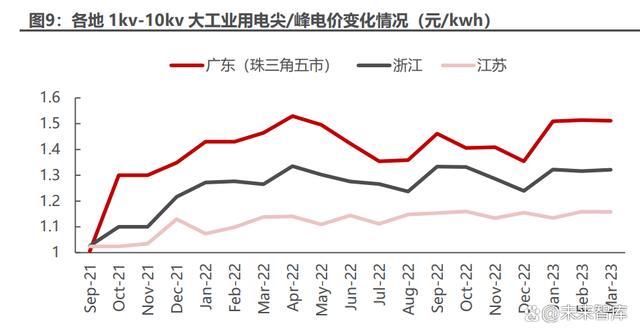 “分時電價”、“電力市場化”政策驅(qū)動,大工業(yè)平均用電價格提高。2021 年 下半年全國大部分省份陸續(xù)出臺分時電價政策,調(diào)整峰谷電價及峰谷時段,其中以 江蘇、廣東、浙江為例的經(jīng)濟(jì)發(fā)達(dá)省份率先、多次調(diào)整,峰谷價差有較大幅度的擴(kuò) 大,尖、峰時段也有不同程度的延長,大工業(yè)平均用電價格提高。