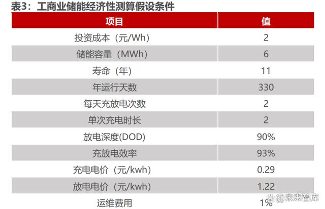 工商業(yè)儲能經(jīng)濟(jì)性測算假設(shè)條件:1)項(xiàng)目案例:浙江 3MW/6.88MWh 用戶 側(cè)儲能系統(tǒng)項(xiàng)目,假設(shè)工廠白天負(fù)荷穩(wěn)定可完全消納儲能放電,且變壓器容量滿足 儲能充電需求;2)項(xiàng)目成本拆分:我們假設(shè)工商業(yè)儲能項(xiàng)目整體投資成本為 2 元 /Wh,其中電池占比 55%,集裝箱占比 15%,BMS 占比 7%;3)運(yùn)行模式:考 慮工廠休息及設(shè)備檢修,儲能設(shè)備每年運(yùn)行 330 天,每天進(jìn)行兩次充放電。第一 次在夜間谷價充電,在上午尖峰電價放電 2 小時;第二次在午間谷價充電 2 小時, 在下午尖峰電機(jī)放電 2 小時;4)峰谷價差:參考浙江工商業(yè)峰谷電價,假設(shè)尖峰 電價 1.22 元/KWh,低谷電價 0.29 元/KWh,峰谷價差為 0.93 元/KWh。