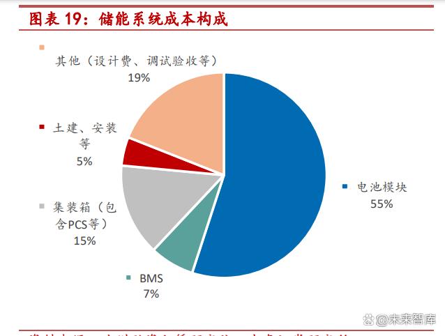 電池為儲能系統(tǒng)第一大成本。儲能系統(tǒng)成本主要由五部分構(gòu)成:電池模 塊、BMS 系統(tǒng)、集裝箱(含 PCS 等)、土建及安裝費(fèi)用、其他設(shè)計調(diào)試 費(fèi)。以浙江省一工廠的 3MW/6.88MWh 儲能系統(tǒng)成本為例,電池模塊占總 成本的 55%。
