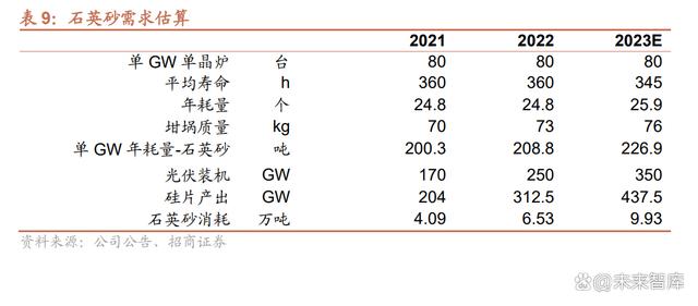 石英坩堝是硅片生產(chǎn)過程中的消材,目前尚無(wú)替代品。石英坩堝主要應(yīng)用于光伏 及半導(dǎo)體領(lǐng)域的拉晶環(huán)節(jié),是硅片生產(chǎn)流程中的關(guān)鍵材料。在硅棒拉制過程中, 石英坩堝逐步向方石英轉(zhuǎn)化,一定時(shí)間后無(wú)法使用,需要更換新的石英坩堝,在 硅片環(huán)節(jié)生產(chǎn)過程中具備較強(qiáng)的消耗品屬性。 石英坩堝原材料為高純石英砂,目前與高純石英砂比較相似的產(chǎn)品是合成石英砂, 但因成本及微量元素含量的限制,無(wú)法使用于光伏領(lǐng)域。 預(yù)計(jì) 2023 年石英砂供需偏緊。需求方面,預(yù)計(jì) 2023 年全球光伏裝機(jī) 350GW, 假設(shè)每100GW硅片的石英消耗為1.8-2萬(wàn)噸,則石英砂需求預(yù)計(jì)9.3-10.3萬(wàn)噸; 供給方面,尤尼明+TQC 合計(jì) 2.5-3 萬(wàn)噸產(chǎn)能,石英股份 4.5-5 萬(wàn)噸,其他產(chǎn)能 合計(jì)約為 1 萬(wàn)噸,供給預(yù)計(jì)在 8-9 萬(wàn)噸。 此外,2023 年海外石英砂占總產(chǎn)能比重約為 35%左右,整體看,行業(yè)內(nèi)石英坩 堝使用壽命會(huì)下降,石英砂需求會(huì)進(jìn)一步提升,2023 年石英供需緊張相對(duì)明確, 漲價(jià)時(shí)間及幅度可能會(huì)超預(yù)期。