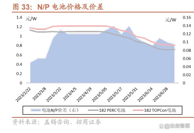 下游接受度躍升。經(jīng)歷 1 年多的市場(chǎng)驗(yàn)證,下游投資方對(duì) N 型優(yōu)勢(shì)理解更加深 刻。尤其是雙面率、衰減及溫度系數(shù)等優(yōu)勢(shì)帶來(lái)的發(fā)電量增益,隨實(shí)際應(yīng)用的實(shí) 證數(shù)據(jù)逐步體現(xiàn),TOPCon 已得到行業(yè)性的認(rèn)可。近期部分招標(biāo)項(xiàng)目 N 型份額 已由此前 10%上下提升至近 50%。2021 年 PERC 市占率約 91%,2022 年降至 88%,而 N 型份額由 2021 年 3%提升至 9%,N 型電池進(jìn)入規(guī)模化應(yīng)用階段。 溢價(jià)不斷放大。近期 N 型組件與 P 型組件的價(jià)差,已由 2 月的 0.05 元/W 逐步 攀升至 0.06-0.14 元/W(近期組件報(bào)價(jià)偏分散),整體溢價(jià)逐步放大,原因主要 系隨 N 型產(chǎn)品進(jìn)一步降本增效、電站有效驗(yàn)證的形成,TOPCon 優(yōu)勢(shì)不斷驗(yàn)證, 下游對(duì) N 型組件的需求優(yōu)先級(jí)更高,高效組件的議價(jià)能力更強(qiáng)。如果效率繼續(xù)提 升,溢價(jià)有望進(jìn)一步放大。而 TOPCon 電池供應(yīng)相對(duì)緊張,相較 PERC 溢價(jià)由 0.06 元/W 上下爬升至 0.1 元/W。