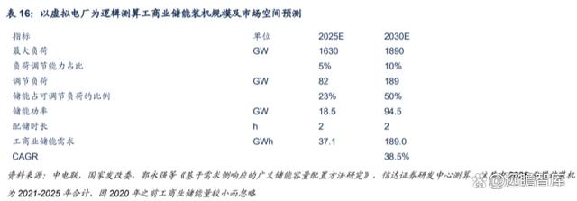 虛擬電廠帶來工商業(yè)儲能遠期需求超預期的可能?;诜植际焦夥难b機并估計儲能的滲透率,由于目 前量較小,滲透率較低,且工商業(yè)企業(yè)眾多,變化較大。能夠認為工商業(yè)儲能提供給用戶側充足的靈活 性資源,奠定虛擬電廠的發(fā)展基礎,而虛擬電廠的建設增添未來收益增長的預期,或將改變工商業(yè)儲能 的投資屬性,進而促進工商業(yè)儲能的發(fā)展,打開工商業(yè)儲能的遠期空間。這或將帶來下游企業(yè)的觀念的改變、儲能的剛需屬性凸顯,進而有望帶動儲能滲透率的快速提升。預計在虛擬電廠建設順利的情況下, 工商業(yè)儲能 2025、2030 累計裝機有望達 37GWh、189GWh。