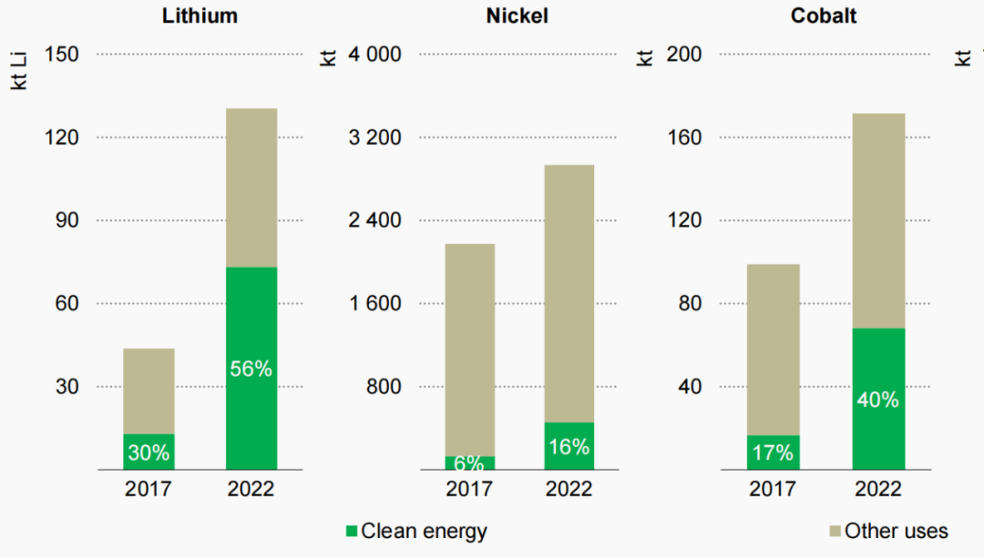 圖4 清潔能源應(yīng)用占鋰、鎳、鈷需求比重 (來(lái)源:IEA)