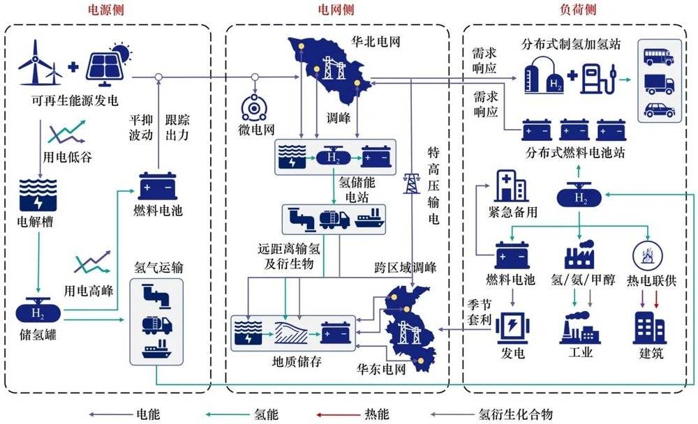 ?、?氫儲能作為電力系統(tǒng)“源網(wǎng)荷”多側(cè)的關(guān)鍵靈活性資源,可促進(jìn)“源網(wǎng)荷儲”各環(huán)節(jié)協(xié)調(diào)互動,實(shí)現(xiàn)新型電力系統(tǒng)在不同時間尺度上的電力電量平衡;
