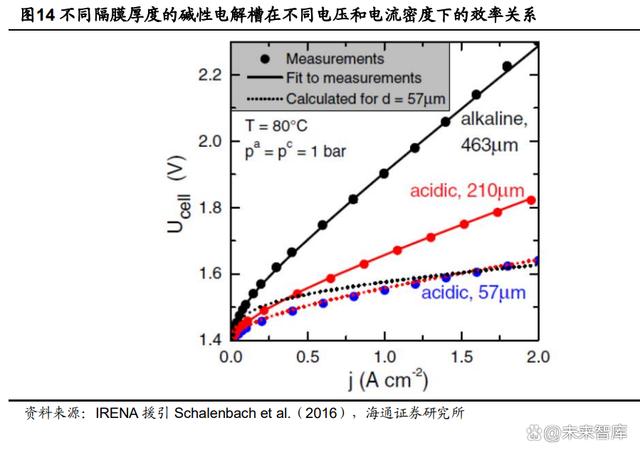 減小隔膜厚度:可以提高效率并減少電力消耗。隔膜越薄,將 OH-從陰極運(yùn)輸 到陽極的阻力就越低,但由于氣體滲透水平較高,從而可能導(dǎo)致安全問題。另 一個(gè)缺點(diǎn)是耐久性較低,因?yàn)楦裟ぶ懈锌赡軙纬舍樋?,?dǎo)致機(jī)械魯棒性降 低。總體而言,堿性電解槽的隔膜厚度應(yīng)該接近 PEM 槽和 AEM 槽的水平。對 于 PEM 來說,目前最先進(jìn)的膜厚度為 125-175 μm,并有潛力降低到 20 μm。 ALK 目前的隔膜厚度為 460 μm,將其降低到 50 μm 可以使堿槽在 1A/cm2 下 的效率從 53%提升到 75%。