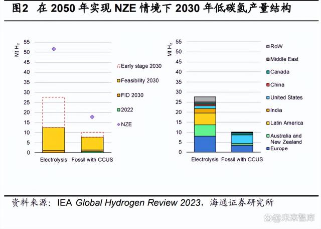 綠氫方面,歐洲、澳大利亞、美國受政策推動(dòng)發(fā)展較為積極,拉美、非洲也有所布 局。根據(jù)國際能源署《全球氫能回顧 2023》,目前已宣布的低碳?xì)漤?xiàng)目多數(shù)為電解氫的 綠氫項(xiàng)目,到 2030 年 70%以上的低碳?xì)渖a(chǎn)可來自電解氫。分區(qū)域來看,歐洲地區(qū)發(fā) 展較為積極的為西班牙、丹麥、德國和荷蘭,合計(jì)占?xì)W洲綠氫總產(chǎn)量的 55%,主要受 IPCEI 項(xiàng)目和歐洲氫能銀行的推動(dòng);澳大利亞依靠豐富的風(fēng)光資源,到 2030 年綠氫產(chǎn)量有望 達(dá) 600 萬噸,并且有望實(shí)現(xiàn)綠氫出口;拉美地區(qū)已宣布的項(xiàng)目到 2030 年綠氫產(chǎn)量也有 望達(dá) 600 萬噸,其中主要集中在智利、巴西和阿根廷;美國主要受益于清潔氫生產(chǎn)的稅 收抵免(Clean Hydrogen Production Tax Credit),至 23 年 9 月的前 12 個(gè)月宣布的電 解槽項(xiàng)目產(chǎn)能達(dá) 9GW;中國方面,已宣布項(xiàng)目正在積極建設(shè)落地(約占總規(guī)劃產(chǎn)量的 40%);非洲地區(qū),已宣布項(xiàng)目到 2030 年綠氫產(chǎn)量有望達(dá) 200 萬噸,主要集中在肯尼 亞、毛里求斯、摩洛哥、納米比亞和南非,已有 9 個(gè)項(xiàng)目規(guī)劃產(chǎn)能超過 1GW。 藍(lán)氫方面,美國和歐洲(英國、荷蘭和挪威)為藍(lán)氫的主產(chǎn)地。根據(jù) IEA 統(tǒng)計(jì)的現(xiàn) 已宣布的項(xiàng)目預(yù)測,到 2030 年美國藍(lán)氫產(chǎn)量有望達(dá)到 400 萬噸,歐洲有望達(dá) 300 萬噸, 主要產(chǎn)地為英國、荷蘭和挪威。
