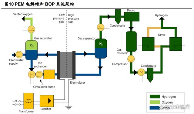 堿性電解槽需要將電解質(zhì)(KOH)再循環(huán)到電池組組件中,從而需要額外的堿液循 環(huán)泵,這個(gè)過程中會產(chǎn)生效率損耗(通常小于電堆功耗的 0.1%)。完成電解反應(yīng)后,氫 氣和氧氣會在氣液分離系統(tǒng)中分別與堿液分離。補(bǔ)水系統(tǒng)負(fù)責(zé)保證水源的穩(wěn)定連續(xù)供給, 并且需要考慮隔膜的水滲透。此外,系統(tǒng)組件還包括后續(xù)的脫氧干燥系統(tǒng)等。
