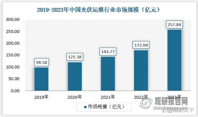 在雙碳目標推進下,光伏行業(yè)將長期處于高速發(fā)展期,將帶動光伏運維行業(yè)進一步發(fā)展。伴隨我國光伏發(fā)電累計裝機容量增長迅速,光伏運維市場需求持續(xù)增加,行業(yè)迎來黃金發(fā)展期。2022年我國光伏累計裝機容量約為393GW,2023年我國光伏累計裝機容量約為609GW,同比增長超過55%,因此在光伏累計裝機容量快速增長的情況下,2023年我國光伏運維行業(yè)市場規(guī)模達到257.84億元,同比2022年增長49.87%。