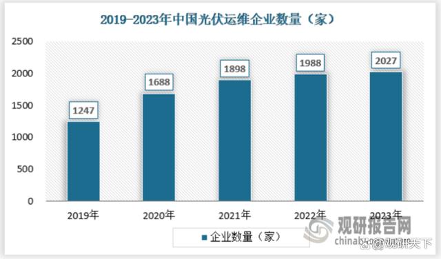 隨著我國光伏行業(yè)的發(fā)展,光伏裝機量的增長,對光伏運維需求的增加,我國光伏運維企業(yè)數(shù)量呈上升趨勢,2023年我國光伏運維企業(yè)數(shù)量達到2027家。