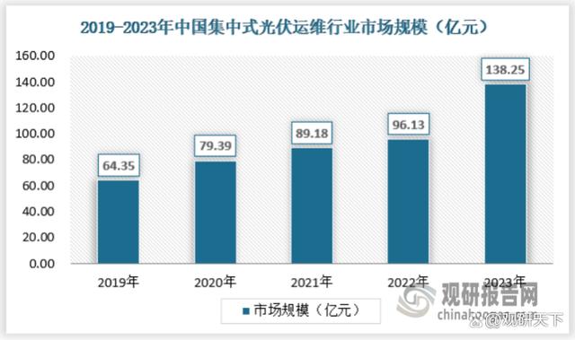 集中式光伏電站是指在荒漠、戈壁等地區(qū)建設(shè)的大型光伏電站,規(guī)模較大,發(fā)電直接并入公共電網(wǎng),供給遠距離負荷。這種電站的建設(shè)需要大量資金投入,但可以有效利用豐富的太陽能資源,降低運輸成本。目前我國光伏發(fā)電結(jié)構(gòu)中,集中式光伏占據(jù)主要地位,因此集中式光伏運維市場規(guī)模較大,2023年達到138.25億元。2023年新增集中式光伏裝機容量約為120GW,同比增長230.71%,2023年累計集中式光伏裝機容量約為354W,同比增長51.19%,因此2023年市場規(guī)模較2022年增長迅速,行業(yè)市場規(guī)模同比增長43.81%,具體如下: