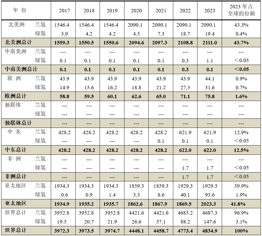 縱觀全球2023年氫氣生產(chǎn)仍然以從化石燃料制氫“蘭氫”為主,占96.9%,而從再生能源制氫“綠氫”為輔,僅占3.1%,再生能源制氫是發(fā)展方向,但中南美洲、獨(dú)聯(lián)體、非洲等地區(qū)的蘭氫沒有行動(dòng);獨(dú)聯(lián)體、中東和非洲的“綠氫”也沒有行動(dòng)。