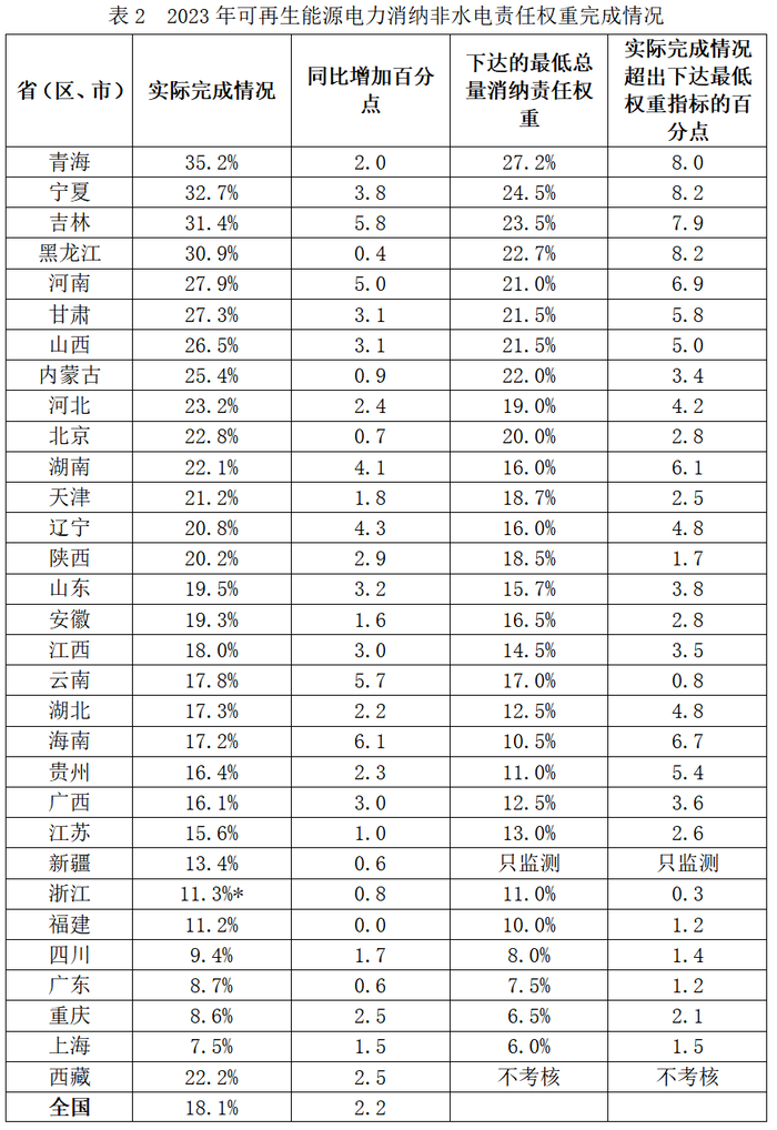 根據(jù)《國家發(fā)展改革委辦公廳 國家能源局綜合司關(guān)于2023年可再生能源電力消納責任權(quán)重及有關(guān)事項的通知》(發(fā)改辦能源〔2023〕569號),綜合考慮各省本地生產(chǎn)、本地利用以及外來電力消納情況,全國各省(自治區(qū)、直轄市)可再生能源電力消納責任權(quán)重總體完成較好,具體完成情況如下。