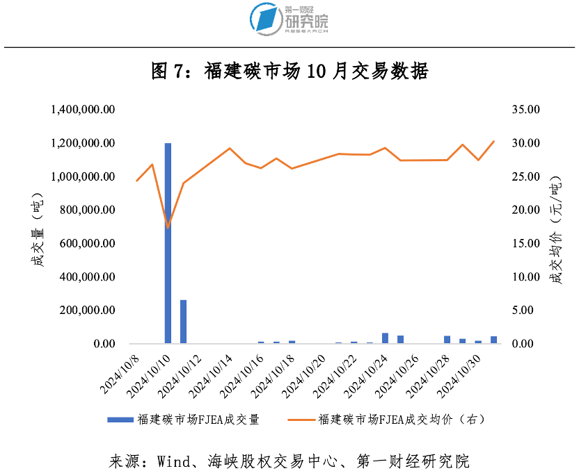 10月福建碳市場碳排放配額(FJEA)成交量180.49萬噸,成交額3677.71萬元。10月最后一個交易日收盤價30.25元/噸,較9月最后一個交易日收盤價27.11元/噸上漲11.58%。