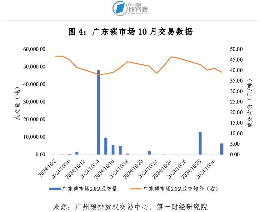10月廣東碳市場碳排放配額(GDEA)成交量9.27萬噸,成交額364.98萬元。期間,最高價50.96元/噸,最低價34.51元/噸,成交均價39.38元/噸。10月最后一個交易日收盤價39.23元/噸,較9月最后一個交易日收盤價43.02元/噸下跌8.81%。截至10月31日,GDEA累計成交量2.29億噸,累計成交額66.17億元。