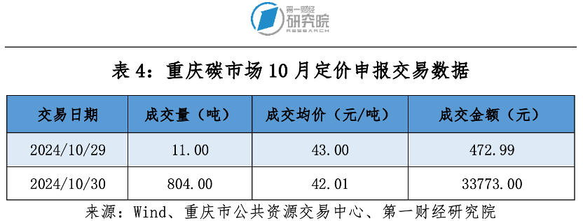 10月重慶碳市場碳排放配額(CQEA)定價申報交易成交量815噸,成交金額3.42萬元,最高價43.00元/噸,最低價42.00元/噸,成交均價42.02元/噸。10月成交申報交易成交量10000噸,成交金額40.80萬元。